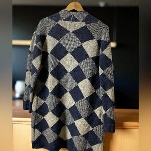 Elevate your wardrobe with this elegant blue and gray argyle cardigan. Perfect for layering and adding a touch of sophistication to any outfit.