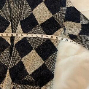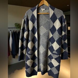 Elevate your wardrobe with this elegant blue and gray argyle cardigan. Perfect for layering and adding a touch of sophistication to any outfit.