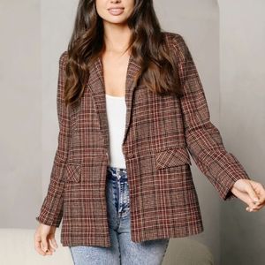 Peach Love California Vintage Chic Blazer. Made of quality material in brown colors in a plaid pattern. One button closure and looks great worn open. On trend side pockets. Fully lined. On trend relaxed oversize fit. Wear with your fave jeans for an instant vintage chic look. Sure to become a fave !