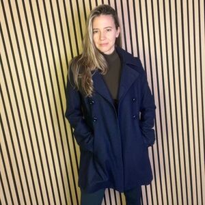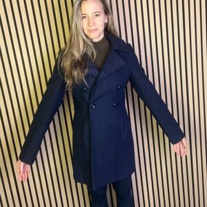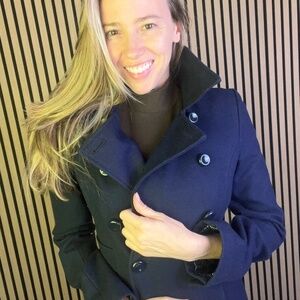 EXCELLENT CONDITION! No special name brand…Just a precious peacoat that it’s time to let go! Size Small! Fits a woman of 5”6/5”7 height and is a 32/34 size rib for the chest/bra! Slim fitting jacket for a small frame size lady!