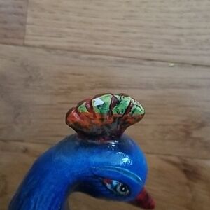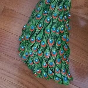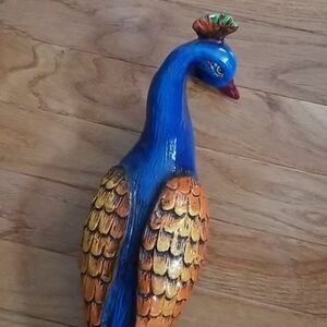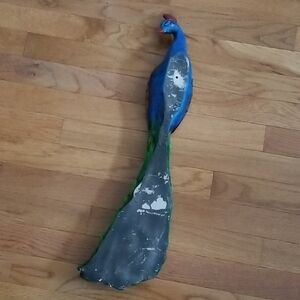 Peacock Colorful Ceramic Decorative. Some minor chips but not super noticeable. Back has some scratches but not seen when hung. Small hole to hang on the back. Beautiful unique piece! About 22" tall.
