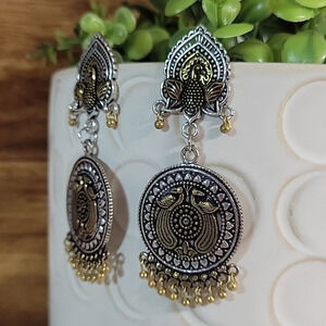 Two-tone intricate detail medallion drop earrings. Handmade in India. Hypoallergenic posts.