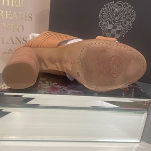 Has a 3.5 heel and made with leather upper, man-made fabric lining and sole.