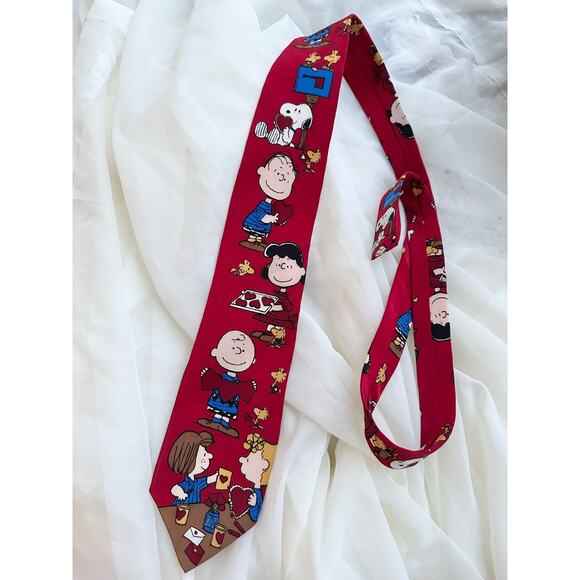 This vintage 90's Peanuts necktie is a red silk accessory perfect for Valentine's Day. Made in the USA, the tie features a classic width with a heart theme, ideal for adding a touch of charm to any outfit. The iconic Peanuts brand and character design make this tie a fun and nostalgic choice for men looking to accessorize with a unique and heartwarming touch.
