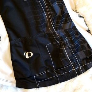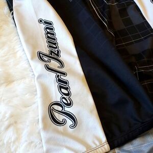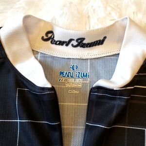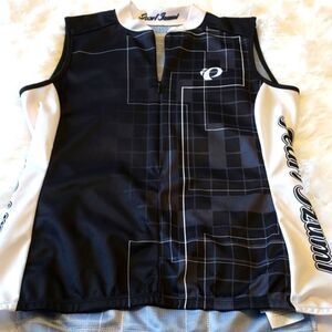 Pearl Izumi bicycle shirt, half zip in the front, back hem is longer than front, has three bottle holders in the back as well. in great condition it does have a small almost not visible snag on the front.