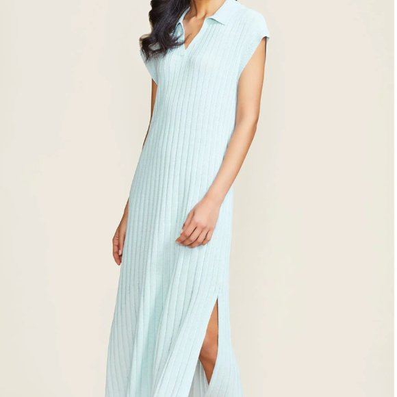 Collared, ribbed knit dress. Sky color. 80% cotton and 20% Nylon. Pullover style