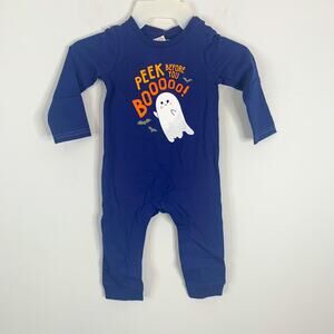 PEEK Before You Boo Navy Ghost Print Baby Jumpsuit Romper Onesie. Snaps on legs. Long sleeves. Crewneck. V4