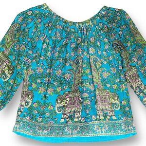 PEEK Girls Peasant Top Sz Large 8 Teal Blue Pink Boho Paisley Floral Elephant