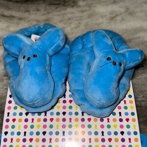 For Sale is a Brand New in Package Peeps Bunny Baby Set and Matching Teether in Blue. Included in the matched set is a bunny hat with embroidered eyes, a bandana style bib with adjustable hook & loop fastener - embroidered with the words PEEP PEEP and yellow bunny peeps, a pair of bunny slippers with elastic ankles and embroidered eyes and a matching blue rubber bunny peeps ring teether set. All items are fashioned after the Easter Peeps bunny marshmallow treats. Everything is on the original cards. Comes from a Smoke Free and Pet Free Home.