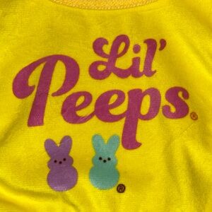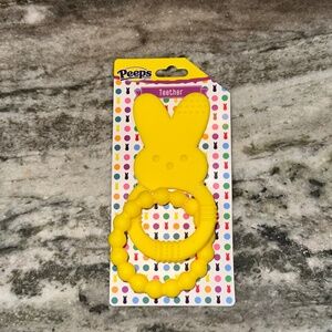 For Sale is a Brand New in Package Peeps Bunny Baby Bib and Matching Teether in Yellow. Included is a square style bib with adjustable hook & loop fastener - printed with the words LIL' PEEPS with a pale green & purple bunny peeps and a matching yellow rubber bunny peeps ring teether set. All items are fashioned after the Easter Peeps bunny marshmallow treats. Everything is on the original cards. Comes from a Smoke Free and Pet Free Home.