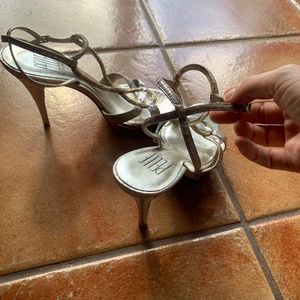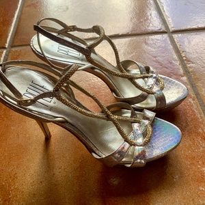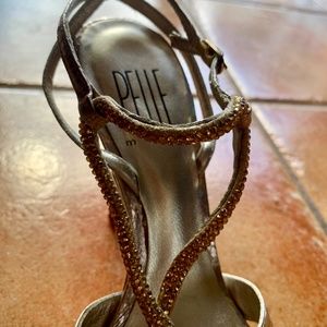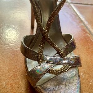 PELLE moda Vero Cuoio silver and gold heels with platforms size 6 1/2. Color: Iridescent silver on embossed snakeskin, gold sparkling rhinestones on front straps. Straps wrap around ankle. Cushioned bed. Ties at ankle with small buckle.