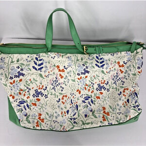 This PENCIL & PAPER CO X NEELY & CHLOE large tote bag blends whimsy and function with a colorful wildflower print on canvas and vibrant green faux leather trim. Designed for both charm and practicality, it features gold-tone hardware, a full zip closure, top handles, and an adjustable crossbody strap. Perfect for travel, everyday errands, or spring outings, this tote adds a pop of cottagecore charm to any outfit.