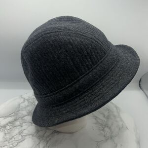 Grey wool in a ribbed textured knit, stain lined on crown. Size large, measures 21.75” around inside of crown.