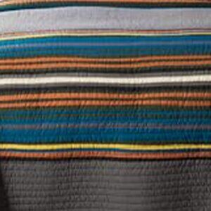 In a bold contemporary striped design, the quilt is colored with rust, blue, gold, black and white against a grey ground with a reversal to solid grey. The set comprises an 86 x 68-inch quilt with one standard sham. The weight is light to medium and can be used throughout all seasons. Wash on gentle.