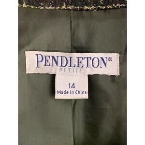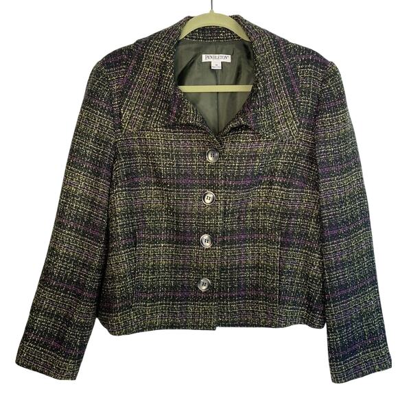 PENDLETON Plaid Blazer Women 14 Petite Black Green Lined Tweed Button Jacket EUC