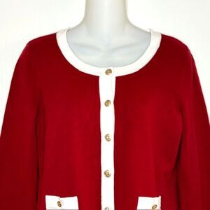 Red and off white cotton knit sweater featuring button front, faux button pockets, long sleeves, gold tone buttons. Made of hand-washable high quality and soft 87% cotton and 13% nylon. In excellent condition except for yellowish stain/mark on the back of the neckline above the back tag, it isn't very noticeable and in no way affects the overall look of this vintage sweater. Measurements: Bust: 36: Length: 23" center back neck to hem
