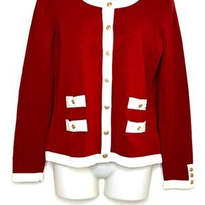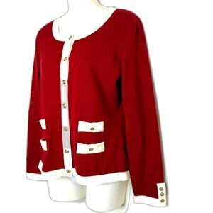 Red and off white cotton knit sweater featuring button front, faux button pockets, long sleeves, gold tone buttons. Made of hand-washable high quality and soft 87% cotton and 13% nylon. In excellent condition except for yellowish stain/mark on the back of the neckline above the back tag, it isn't very noticeable and in no way affects the overall look of this vintage sweater. Measurements: Bust: 36: Length: 23" center back neck to hem