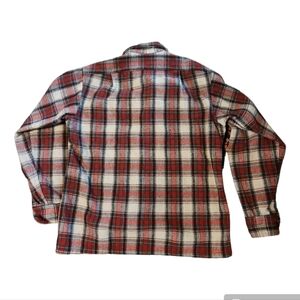 Pendleton VTG 60s Plaid 100% Wool Board Shirt Loop Collar Flap Pocket USA Medium. EUC. One small spot on the lower portion of the button placket. One small moth hole back of neck. Tear back of right arm that would be easy to repair. Great red, black and yellow plaid on gray background.