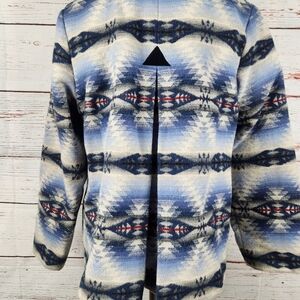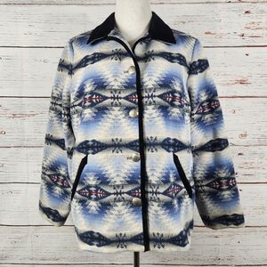 Authentic vintage (late 90's early 2000's) Pendleton Woolen Mills jacket in a stunning Southwestern pattern. Soft gradient blues, subtle red accents, and deep navy make this piece a timeless classic. Crafted from 100% virgin wool with genuine pig suede trim and silver-tone buttons. Fully lined in acetate for comfort.