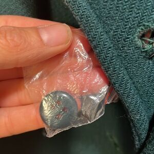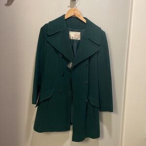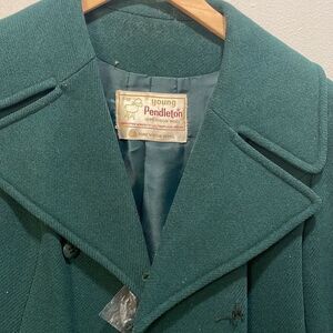 Pendleton dark teal woman’s 100% wool trench coat. This coat is needing a button to be put back on and the other buttons probably need to be reinforced. This coat is super cute and in good condition. The size tag says 11-12.