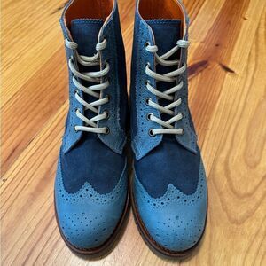 These Penelope Chilvers Blue Brogue Ankle Boots are made of leather with a suede upper and feature a round toe shape, lace-up closure, and flat heel. They are designed for women in size 37.5 (US 7) and are ideal for travel or casual wear in winter, fall, or spring. The boots are accented with the Penelope Chilvers logo and have a comfortable leather lining, making them a stylish choice with a hipster or bohemian vibe.