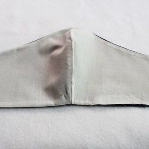 The front of the mask is blue with writing in white. The back of the mask is solid white - it is reversible so you can wear either side.