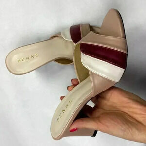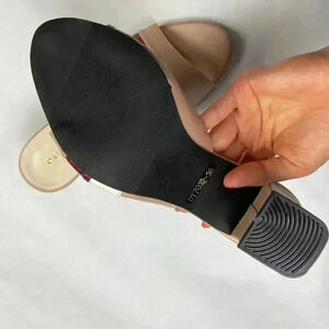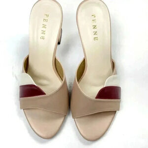 Pretty block heeled sandals with a sculpted, scalloped open toe and white/maroon color blocking over the top of the foot. In great condition, literally only worn around the house. Smoke free home and fast shipping. No size but I wear a size 6.5. Very feminine, the lower heel is easy to walk in and great for summer!!