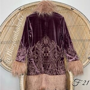 It's all happening...Channel your inner Penny Lane in this velour coat featuring allover ornate embroidery, 2 hook and eye closure, slanted front pockets, long sleeves, shaggy faux fur trim, and a longline hem.
