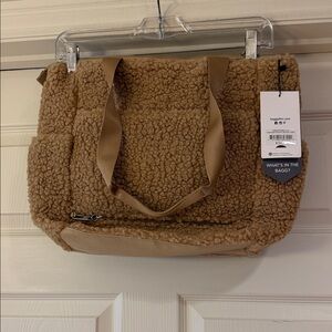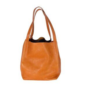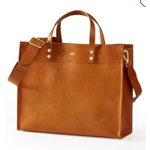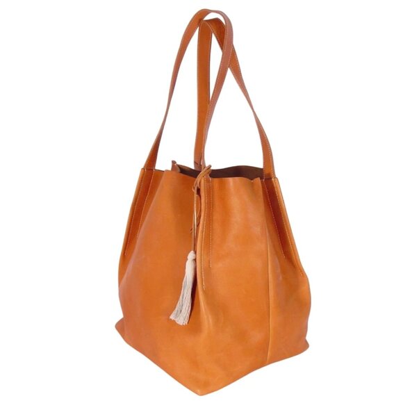 The perfect carryall tote for market or spa, designed with a deep profile for lots of room. Vegetable-tanned leather in a desirable shade called Whiskey. When exposed to sunlight, oils and water, veg tan leather will grow darker and over time develop a lovely dark patina. This patina is natural and is what gives this type of leather its coveted color. Large suede inner zip pocket keeps smaller items separated and secure. Accented with a fabric tassel. Hand Made in Sonoma, California. MSRP: $650.