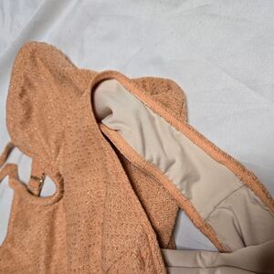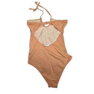 Glitter gold peach one piece halter tie swimsuit by Peony Australia. Minor discoloration shown in photo on the back. Australian size 12, which is equal to a US 8 according to their size chart. Recycled polyester, elastane, metallic.