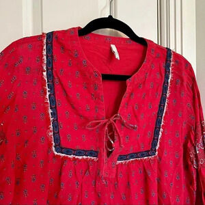 Pepe Jeans red and blue, boho long sleeve, apron criss cross tie front fringe and embroidered blouse size X-Large. Please see the measurements in the pictures. In excellent used condition. Please note it has a slight faded look but it was designed that way!