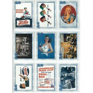 The product is a vintage Pepsi-Cola Series 1 Collector Cards set manufactured by Dart Flipcards in 1994. It consists of 100 standard-sized trading cards made of card stock. The trading cards are part of the Pepsi franchise and were manufactured in the United States. All cards are protected in plastic sleeves as seen in the photographs. Perfect condition.