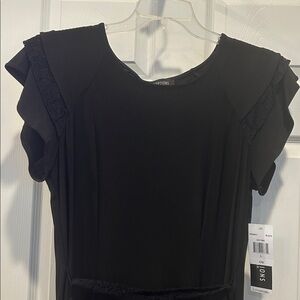 - features: pullover style, stretch fabric, round neckline, short flutter sleeves, a midi length, eyelet ruffle accents , and sash belt