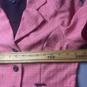 Relevant details: Tailored fitted waist tab style, three black button front closure, short sleeve notched collar, shoulder pads for structured fit