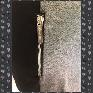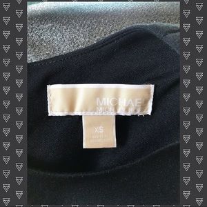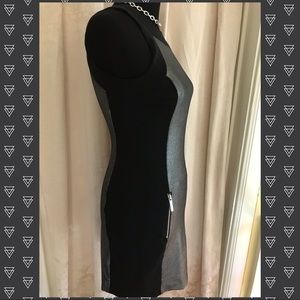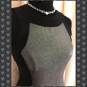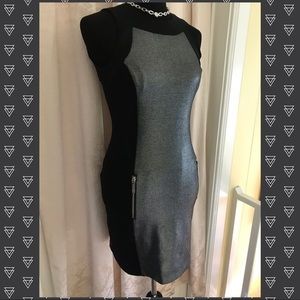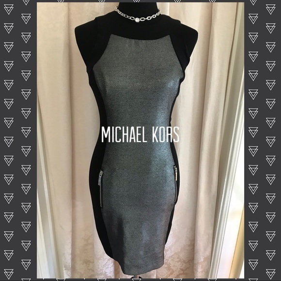 Outstanding LBD by MICHAEL MICHAEL KORS! Sparkling silver fabric accented by slimming bands of black fabric. Cool zippered pockets on front. Lined. Shoulder to hem is 34 inches and under arm to under arm is 16 inches across.