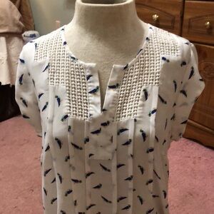 Adorable top lightweight polyester very cool and comfortable has a crewneck with V cut out Center Pattern is cute colorful birds with woven pattern on front and down back adorable colorful birds short sleeves