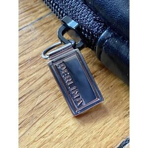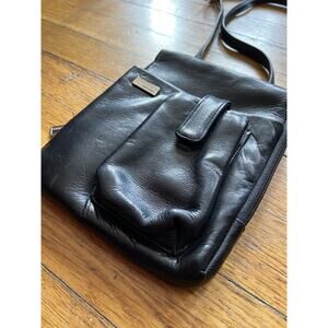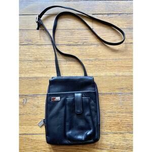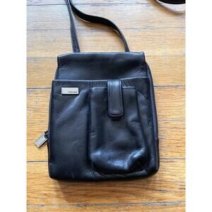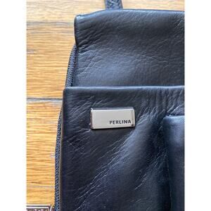 This PERLINA New York crossbody bag is the perfect accessory for any occasion. With a solid pattern and a sleek black exterior, this small bag is made of soft high-quality leather and features silver hardware accents. The zip closure and adjustable strap make it convenient to use, while the exterior/interior pockets and credit card slots provide ample storage space. Ideal for party or casual outings, it has plenty of room for your essentials such as; keys, credit cards/money, make-up and cell phone. The strap drop ranges from 20.5 inches to 22.5 inches, making it easy to wear. The logo pull, logo plaque, and zip around accents add a touch of elegance to the bag. *Note: Leather has minor markings from use (as photo shows), but overall in excellent condition.