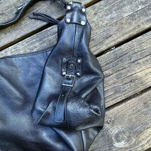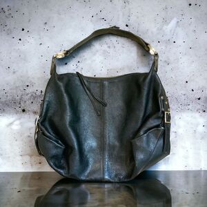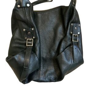 Super cute made in Italy leather zip top, side buckles and buckle strap tote bag. This is in excellent pre-owned condition but for some faded white on the interior pockets and there’s something on the zipper (doesn’t affect the zipper at all), see photos.