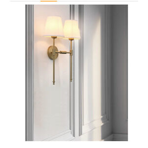 PERMO CLASSIC RUSTIC DOUBLE SCONCE 2-LIGHTS WALL SCONCE LIGHTING FIXTURE WITH FLARED WHITE TEXTILE LAMP SHADE AND AND ANTIQUE BRASS FINISHED LONG ARM,WALL SCONCE LIGHT FIXTURE FOR BATHROOM BEDROOM