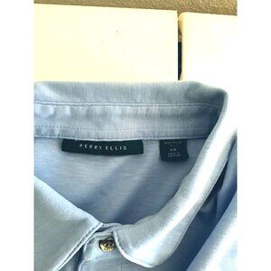 The Perry Ellis Men's Blue Short Sleeve Polo Shirt in size large combines classic style with ultimate comfort. Ideal for casual or semi-formal wear.