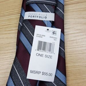 PERRY ELLIS Mens Neck Tie Burgundy Blue Stripe Classic Pointed
