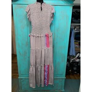 PERRY WALKER 75% SILK MAXIDRESS MADE IN INDIA. LAVENDER AND PINK IN PATCHWORK BLOCK PRINTS WITH RUFFLE TRIM. FLOWY SKIRT. CHEST STRETCHES FROM 16" TO 21" UNDERARM TO UNDERARM. LENGTH IS 52". FESTIVAL READY! WAS $230