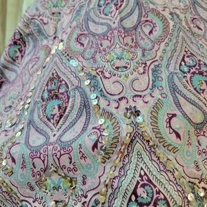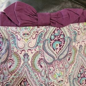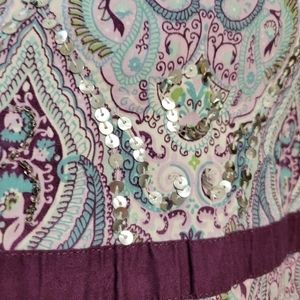 This pleated skirt is just adorable! Features paisley in plum, violet, tiffany blue and green. Has fantastic sequin and beads running along the bottom. Zip back closure. Has a liner. Has a plum bow at the top for that final touch. Great to dress up after work with a quick shoe change.