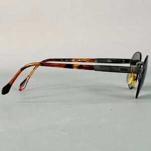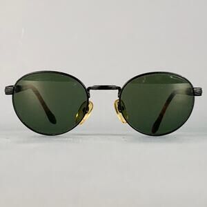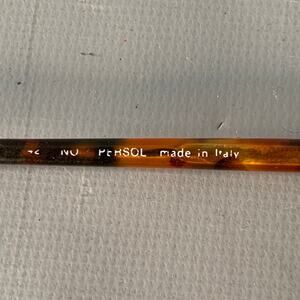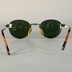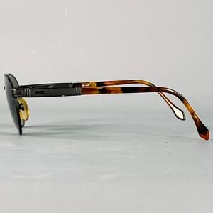 PERSOL sunglasses in a black metal with tortoiseshell temple arms featuring a round shape. Comes with case and box. Sunglasses made in Italy, case made in Romania.