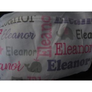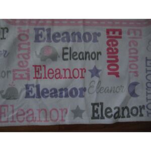PERSONAL CREATIONS BABY COLLAGE NAME BLANKET " ELEANOR " PINK AND LAVENDER ON A WHITE BACKGROUND SO SWEET. SOFT AND COMFY 30 x 40". PERFECT UNUSED CONDITION.