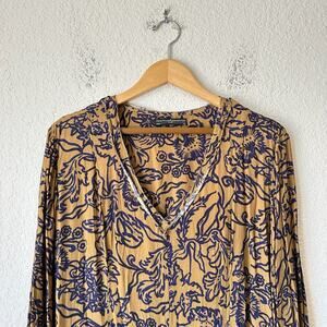 The Peruvian Connection Mini Dress in women's size XL features a brown and blue floral pattern, puff sleeves, and a V-neckline. This boho style dress is perfect for travel and casual occasions, made of viscose material with pleated accents. With a short dress length, long puff sleeves, and a pullover closure, this lightweight dress also includes pockets and is ideal for the summer, fall, and spring seasons. Hand wash only, this dress is a stylish addition to any woman's wardrobe with its bohemian theme and flower details.