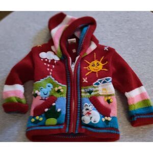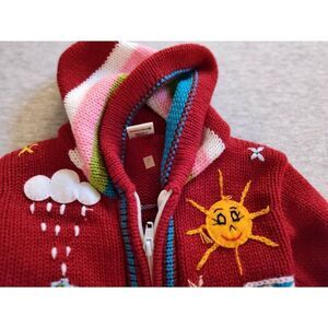 PERUVIAN HAND KNIT PATCHWORK HOODED ZIP UP RED SWEATER NEW