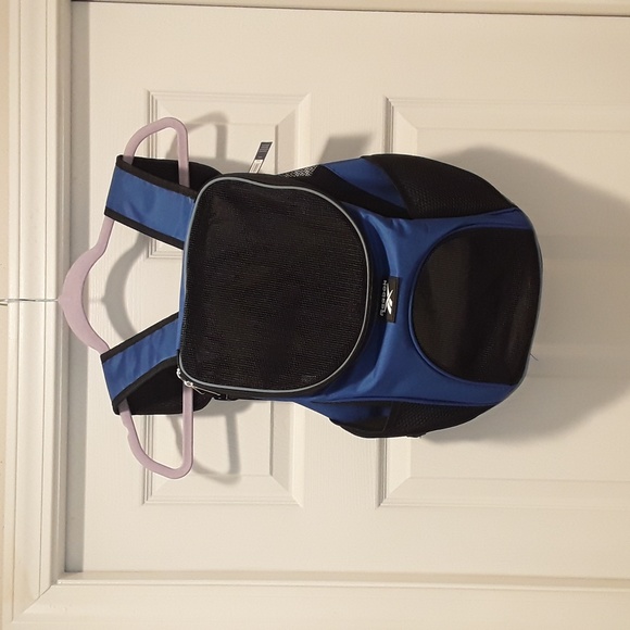 Reebok - Pet backpack. four mesh breathable portals, two good sized mesh pockets on the side for water bottles storage or treats. size is Small the measurements are 17"X 15"