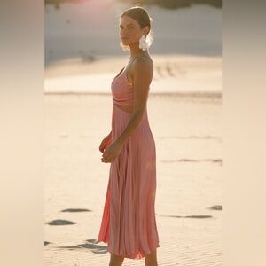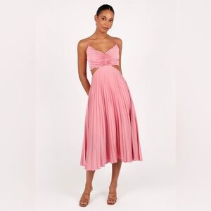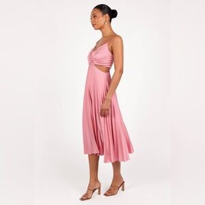 This midi dress will be the star of your wardrobe! With its v neckline, thin adjustable straps, and back invisible zip you'll feel like a total glam queen. The side cut out feature adds a modern touch, while the pleated satin fabric exudes elegance.