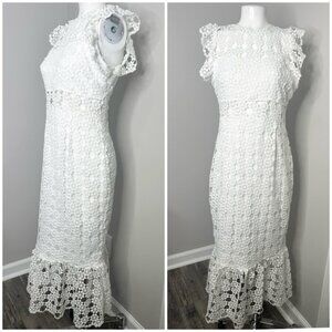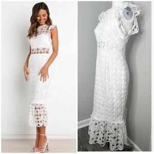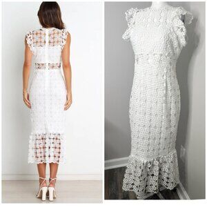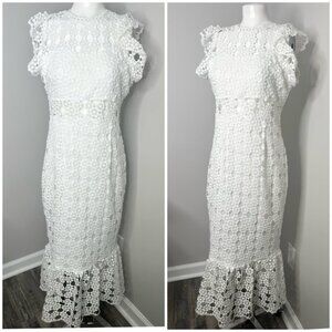 Elevate your wardrobe with the chic and timeless PETAL & PUP white lace dress. Designed for a versatile fit, this size 8 bodycon dress flatters with a round neck and short flared sleeves, perfect for a range of occasions from parties to weddings. The solid white color exudes classic elegance, while the lace fabric and additional cut-out details add a touch of modern sophistication.